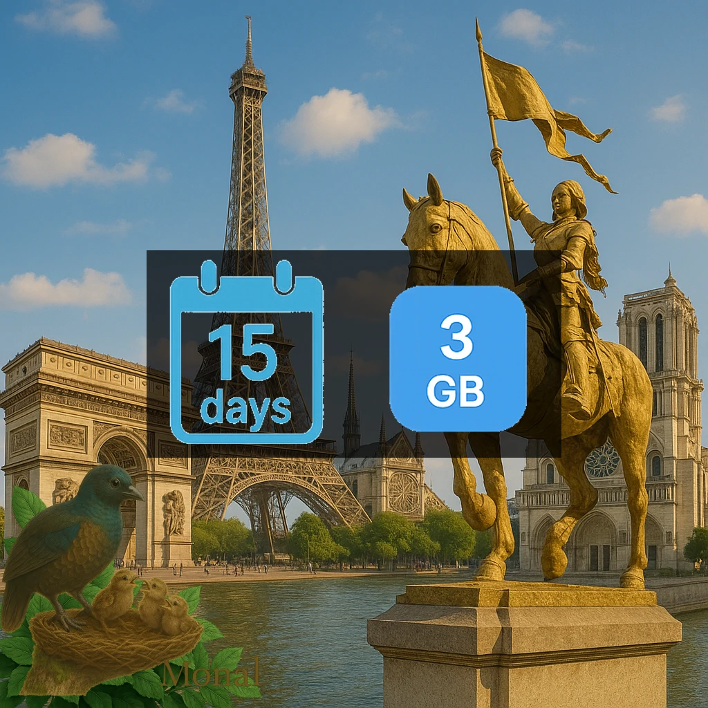 France 3GB 15Days Get 3 GB of high-speed data for your travel needs. Perfect for travel in France. Valid for 15 days once activated. You have 180 days to activate after purchase. Enjoy 3G/4G/5G network speeds for fast and reliable connectivity. Connects via premium networks including Bouygues, Free Mobile, Orange for the best coverage. Supports top-up options to extend your data when needed. Instant delivery via email - no physical SIM required. Simply scan the QR code to get connected.