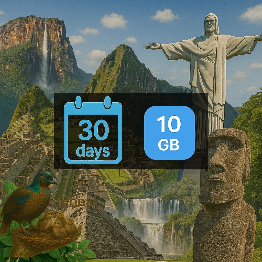 South America 10GB 30Days Get 10 GB of high-speed data for your travel needs. Great for multi-country travel including Argentina, Bolivia, Brazil and 2 more destinations. Valid for 30 days once activated. You have 180 days to activate after purchase. Enjoy 3G/4G/5G network speeds for fast and reliable connectivity. Connects via premium networks including Antel, Claro, Digicel for the best coverage. Supports top-up options to extend your data when needed. Instant delivery via email - no physical SIM required. Simply scan the QR code to get connected.